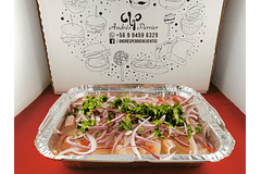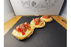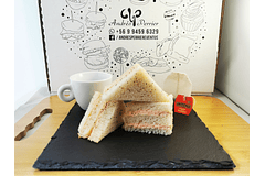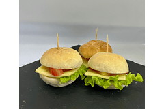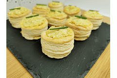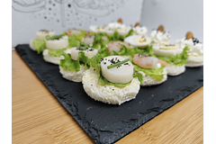 Caja con 100 canapés de 4 variedades: camembert y shutney de frambuesa, brie y frutillas, jamón serrano y piña, salmón ahumado y queso crema.